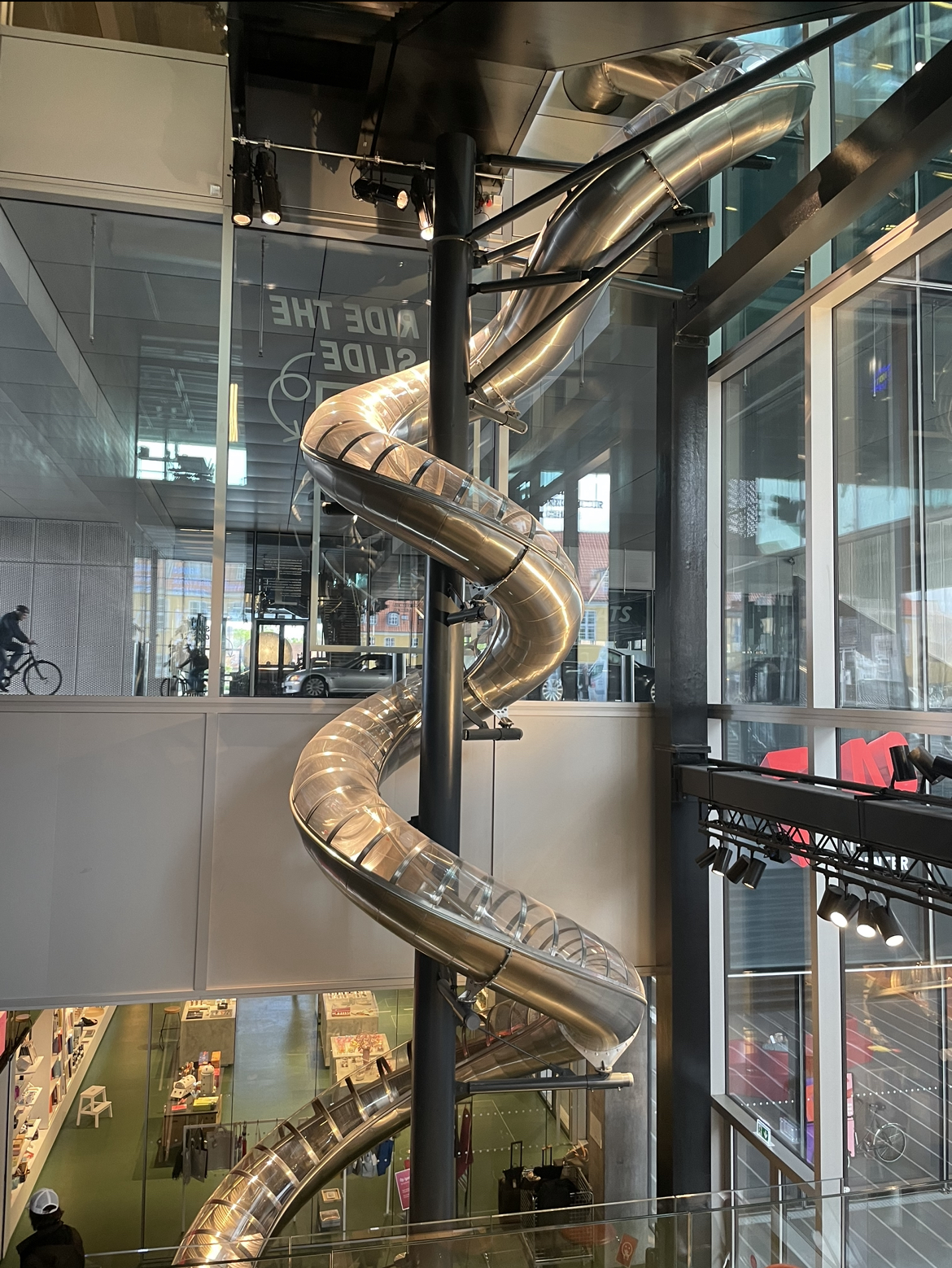 I started to feel a little less jetlagged than I did before, which was nice because crashing at four in the afternoon is not ideal for sightseeing. We went on a walking tour around Denmark with Thomas to visit design studios showing many modern designs. This helped keep us all awake, and it was enjoyable not only to see the history but also to hear about it because I would have walked right by many buildings and firms. After taking a break to get lunch, we went on another tour, but it was on our bikes! Being able to bike on flat land and at sea level almost felt like nothing, and I barely noticed we were biking for hours. This tour was fun because we got to bike to specific landmarks and hear, for instance, why a building was made and why. It was nice to bike around and see everything from a different perspective. I also learned quickly that you don’t run yellow lights in Denmark. Yellow means to stop; after that, it flashes yellow, which means to go again. I was the American who ran through some lights now and then, but I got better. We visited the blox museum and firm, which looked exactly like a bunch of black boxes piled on each other. The museum was interactive and enjoyable, and they even had a giant metal slide! I bonked my knee going down that slide, but I would do it again.