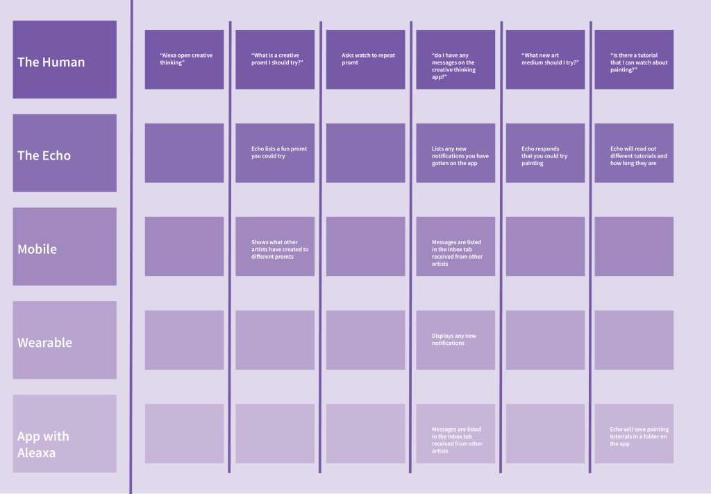 | Additional digital component | The experience would be compatible with the apple watch or other smart watches. It would give reminders and what prompts you can try and motivational reinforcement messages while you are in the process of creating art. This will aid users being handsfree in case the art they are creating is messy. Allows the user to still access the program if they are not near an Alexa. | Smart watches would need to be compatible with the users phone with either IOS or android. The smart watch will also need to be able to download the creative thinking app to be able to receive notifications and respond to actions. |